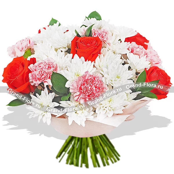 Роза красная - 15 шт., гвоздика розовая - 16 шт., хризантема кустовая белая - 10 шт., рускус, фетр розовый.