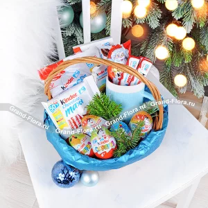 Стандартный: роза красная - 1 шт., мандарины - 2 шт., эвкалипт - 1 шт., хлопок - 1 шт., шишки - 2 шт., корица, шарик, ель, оазис, коробка.
