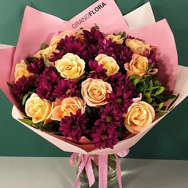 Стандартный: роза кремовая/персиковая(персиково-розовая) - 5 шт., хризантема фиолетовая - 4 шт., декоративная зелень, упаковка, лента. Примерный размер: 25Х25 см.